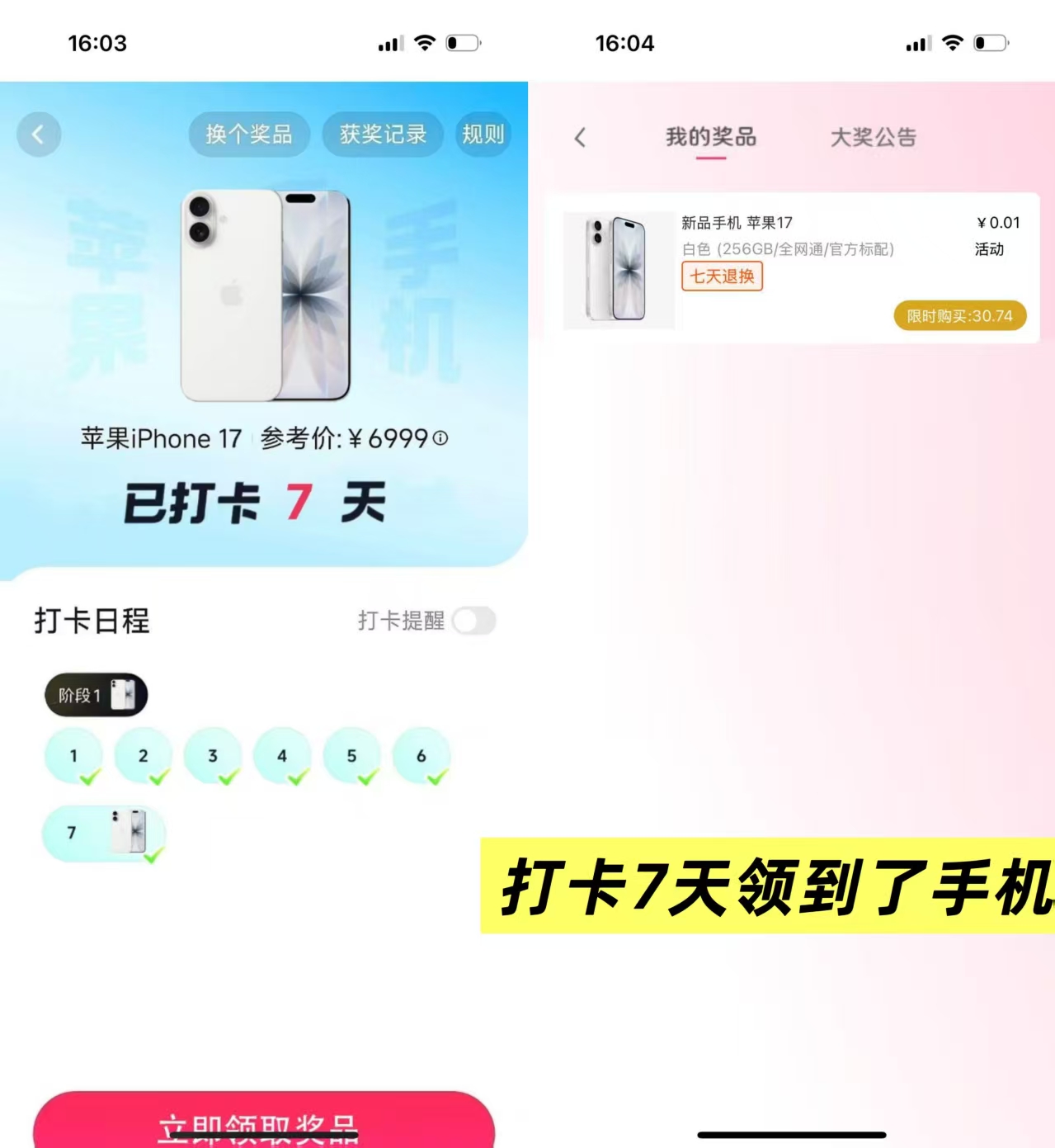 第五步:这个连续打卡4天 有机会变成7天领苹果手机,大家可以试试哟