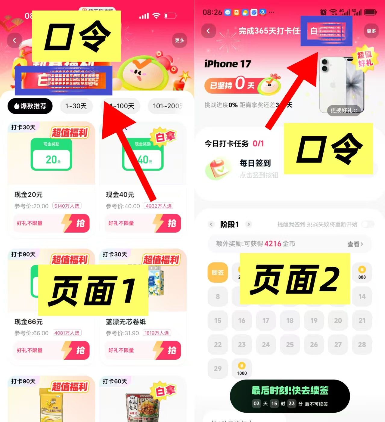 第四步:跳转进去的活动页面最顶部蓝色画圈的4个字就是口令了:【白***】, 这个页面往下滑 找到苹果手机打卡一下,